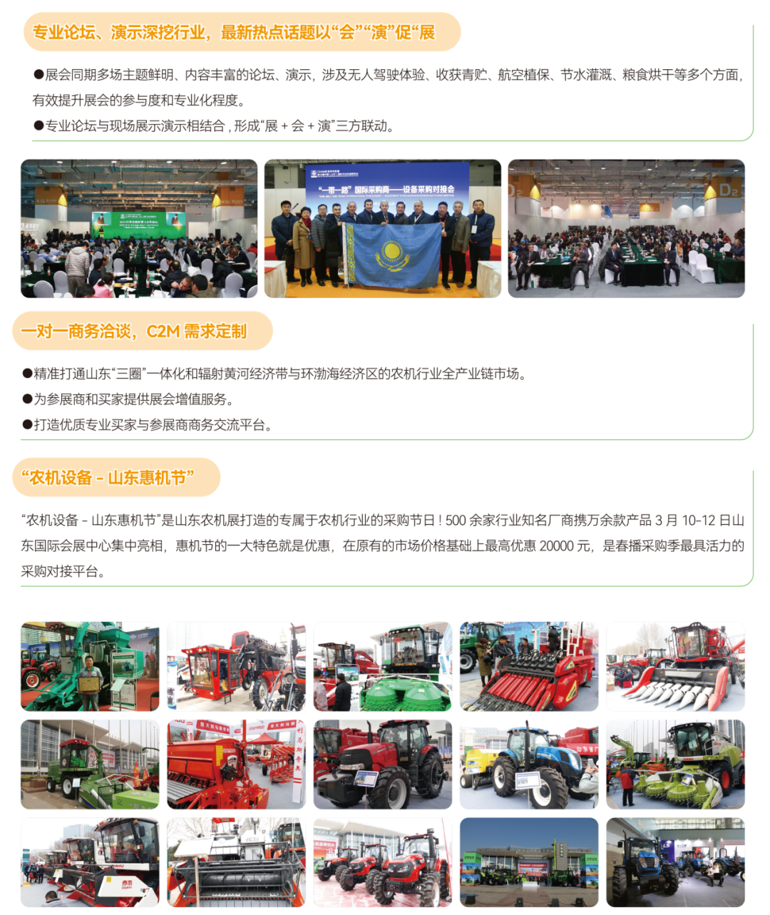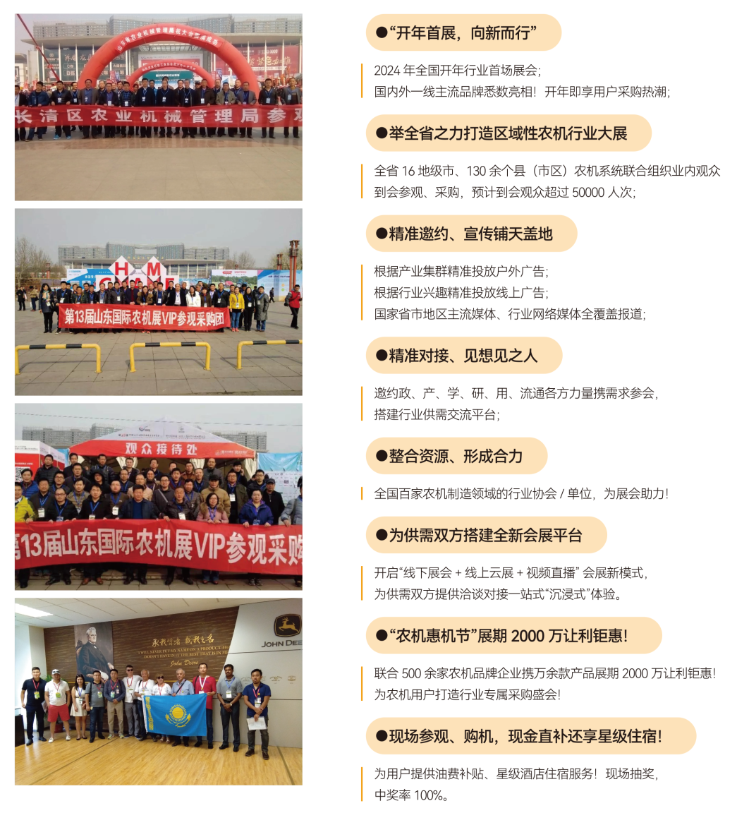 本屆山東農機展以“新格局、新理念、新發(fā)展”為主題,展會還將同期舉辦“農機設備-山東惠機節(jié)”活動。“惠機節(jié)”是展會打造的專屬于農機用戶行業(yè)的采購節(jié)日,組委會將聯(lián)合500余家農機品牌企業(yè)攜萬余款產品展期讓利鉅惠!
