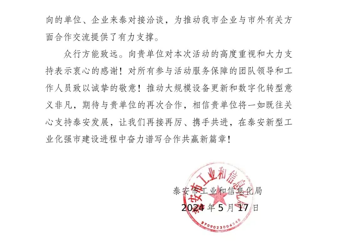 5月17日,泰安市工信局向省智能制造服務(wù)聯(lián)盟發(fā)來感謝信。信中對5月9-10日在泰安新泰舉辦的“全國首場大規(guī)模設(shè)備更新神州行暨數(shù)字化轉(zhuǎn)型展洽會(泰安)專場活動”期間,聯(lián)盟秘書長王世超領(lǐng)銜的團隊所表現(xiàn)出的對工作精益求精,以及過硬的專業(yè)素養(yǎng)和能力、細(xì)致高效的服務(wù)水平等給予了高度肯定,并表示衷心感謝。